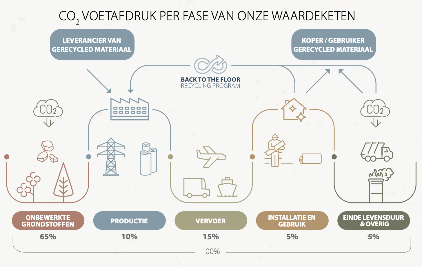 Duurzaamheid gaat verder dan alleen het productieproces. Ook aan het einde van de levensduur van vloeren is het belangrijk om verantwoordelijkheid te nemen. Via het terugnameprogramma ‘Back to the Floor’ werd in 2024 maar liefst 637 ton vloerafval ingezameld uit 14 landen. Van dit afval werd 88 procent hergebruikt of gerecycled, waarvan 35 procent direct werd verwerkt in nieuwe vloerproducten. Ook verpakkingsmateriaal en installatieafval worden actief teruggenomen en opnieuw verwerkt.