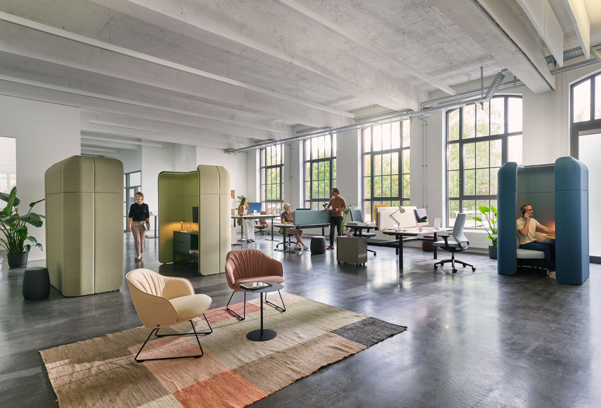 Optionele modules en een breed scala aan stoffen maken het mogelijk om ruimtes te creëren die gericht zijn op concentratie, maar ook informele ontmoetingsplekken voor samenwerking en inspiratie bieden.