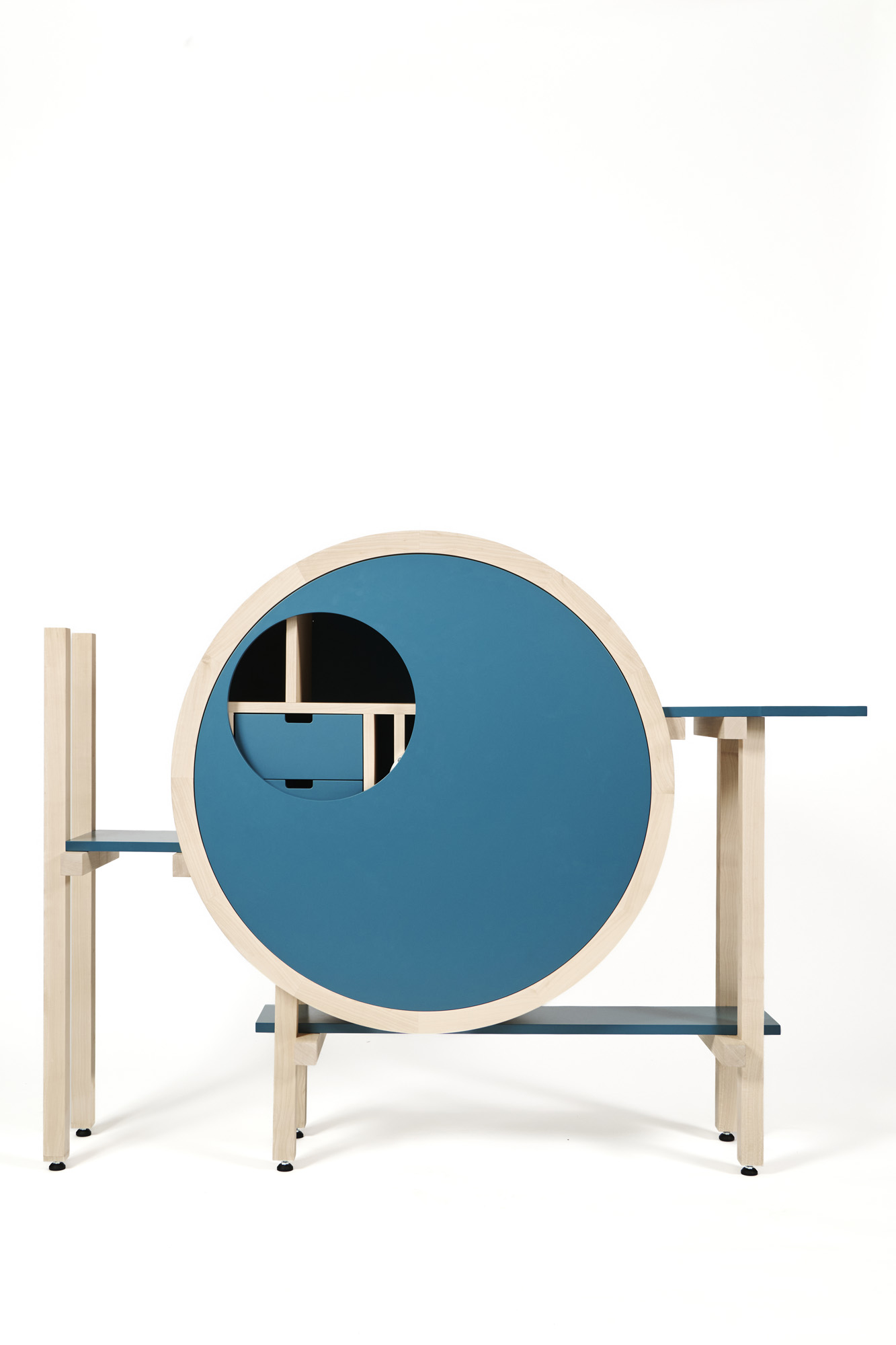 ‘Het ontwerp ontstond uit de combinatie van rondwerk en beweging. Ik heb een ronde esdoornhouten kast ontworpen met een deur die om haar eigen as draait. Door de deur te draaien komt steeds een ander segment in de spotlight en worden de lades toegankelijk. De lichte houtsoort in combinatie met het strakke, blauwe spuitwerk geeft de kast een tijdloze uitstraling. Mijn ervaring met rondwerk vormde de basis voor deze uitdaging: ik wilde niet alleen vorm, maar ook interactie toevoegen. De beweging van de deur voegt een onverwacht element toe. Dit ontwerp valt op door het contrast tussen de ronde romp en de strakke lijnen van het onderstel. De ontwerpen van Gerrit Rietveld zijn een inspiratiebron. Dit is in mijn kast terug te zien in de openheid en geslotenheid, alsook in de horizontale en verticale belijningen. Mijn ontwerp een samensmelting van techniek, esthetiek en een dynamische beleving, zo ontstond ‘Pivot Blue’.’