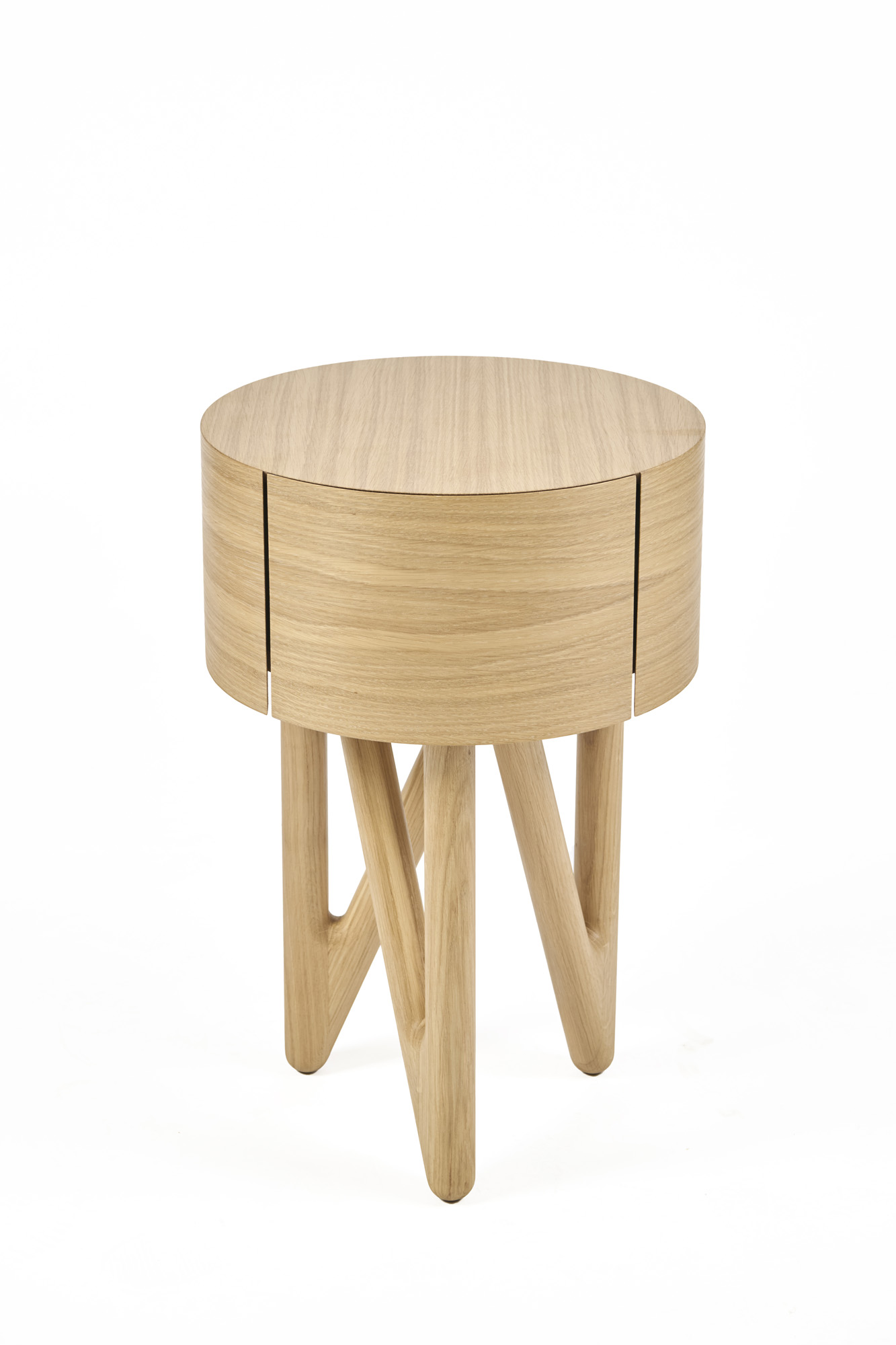 ‘Het verhaal van dit meubel begint met de opdracht voor het ontwerpen van mijn meesterwerkstuk, DE afstudeer-opdracht van het 4de leerjaar van het HMC Amsterdam. Hiervoor hadden mijn Opa en Oma een bijzettafel met een rondblad als wens opgegeven, vanuit mijn opleiding kwam daar de opdracht van een bewegend segment bij. Na schetsen, overleggen en aanpassen is er dit ontwerp uitgekomen: een bijzettafel met een rondblad waarin een lade verwekt is, staande op een doorlopende driepoot. Het blad en de lade zijn rondom zo met eiken fineer bekleed dat de nerf optisch doorloopt. In het meubel zijn kleine verrassende details verwerkt, zoals de Ebben houten zwaluwstaart inleg verbinding in de lade en mijn initialen in de koppel naad van het fineer.’