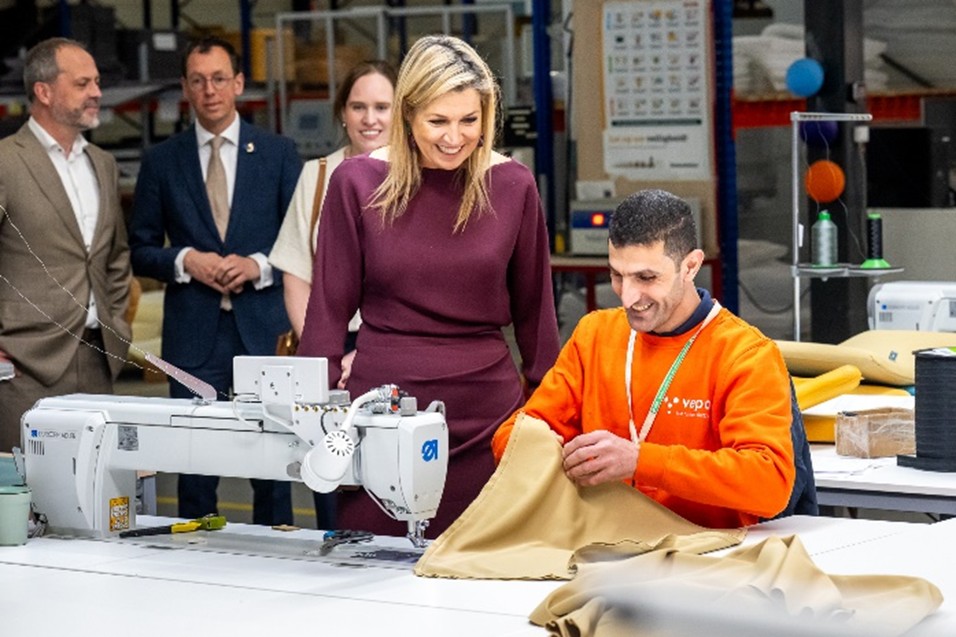Bij Vepa komt alles samen: van grondstof tot nieuw product. Als onderdeel van de Fair Furniture Group ontwikkelt en produceert het bedrijf duurzaam kantoormeubilair en ondersteunt het organisaties bij hun circulaire inrichting: meer en meer meubilair wordt door Vepa opgeknapt voor een tweede leven. Tijdens de rondleiding kreeg Koningin Máxima een inkijk in het volledige productieproces, van de verwerking van houten panelen en het gebruik van biologische materialen als hennep en vlas, tot innovatieve technieken en het revitaliseren van oude meubels. Mazen Alzayat, medewerker stoffeerderij: “Het is bijzonder om de Koningin te laten zien waar we hier iedere dag mee bezig zijn. Voor ons is het gewoon werk, weliswaar mooi werk, maar tijdens zo’n bezoek besef je pas hoe bijzonder het is wat we hier met z’n allen realiseren.”